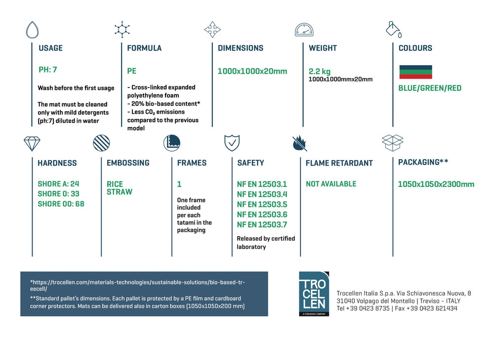 Comme il est résistant à l?eau et au feu, le tatami de karaté de Trocellen peut être utilisé pour des activités à l?intérieur et à l?extérieur Grâce à sa découpe en forme de puzzle et à son faible poids (2 kg/pièce), ce tatami est durable et facile à installe Comme il est réversible, le tatami de karaté permet de créer des surfaces de combat de formes et de tailles différentes en utilisant un seul stockCertificats